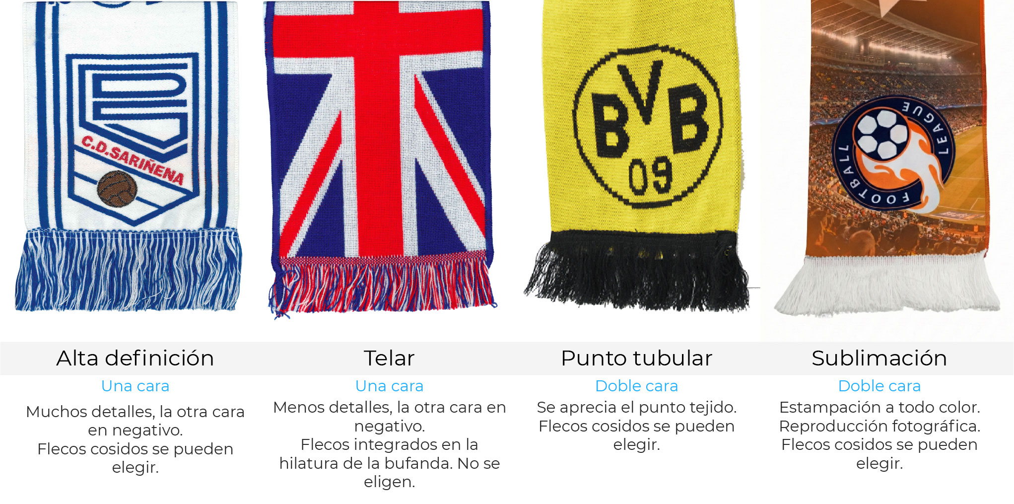 Confeccionada en lana tejida (75% acrílico 20% poliéster), esta bufanda está fabricada con un método avanzado que emplea un hilo más fino y un mayor número de puntadas, consiguiendo un nivel de máxima definición en los colores y detalles del diseño, incluyendo nombres, logos y escudos. De hecho, una de las bufandas personalizadas más detalladas que existen hoy día en el mercado.