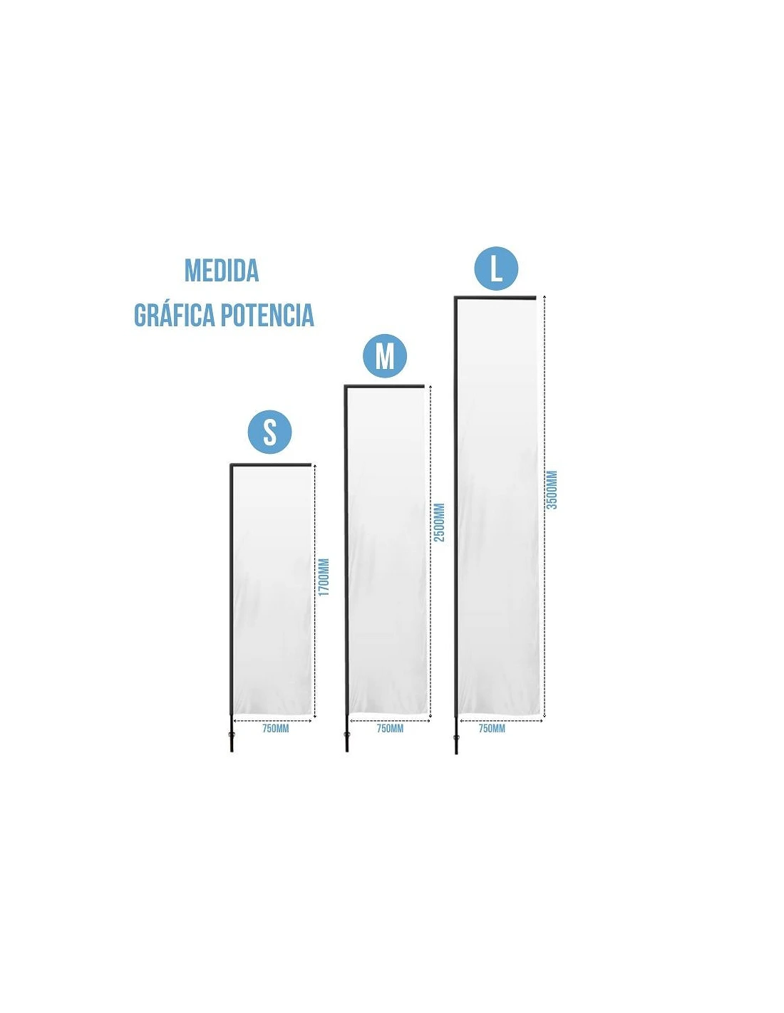 The flag banner potencia is perfect for advertising our brand at any event, celebration, congress, or cultural and sports activities. Its design is completely rectangular and is available in various sizes: S (750x1700mm), M (750x2500mm), and L (750x3500mm). It can be complemented with any of the supports available on our website.