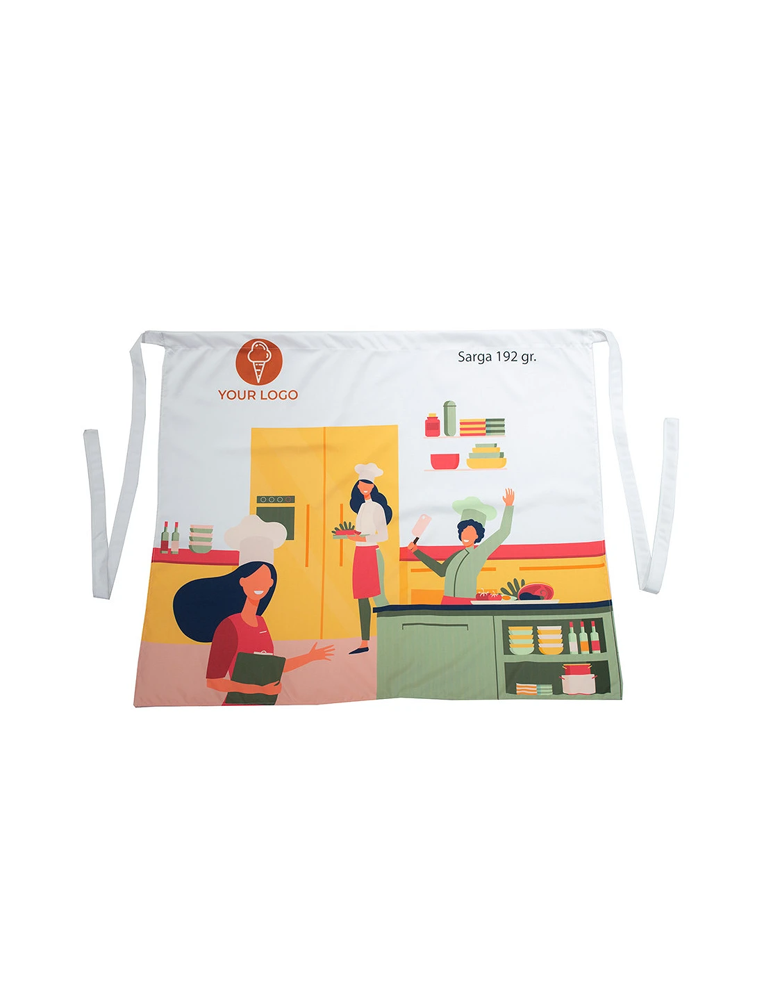 Available in 192 g, 230 g, and 260 g Twill fabrics (100% polyester). For a proper waist fit, it has tying tapes of the same fabric. Additionally, there is the option to add a central pocket of 40x24 cm. The full apron size is 104x97 cm.