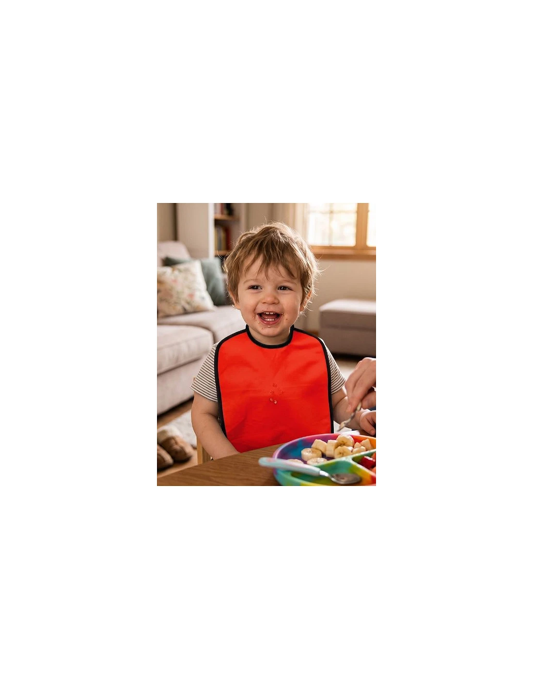 Child bib for celebrating gastronomic events or meals. Finished with bias binding around that allows for a great fit around the neck.
