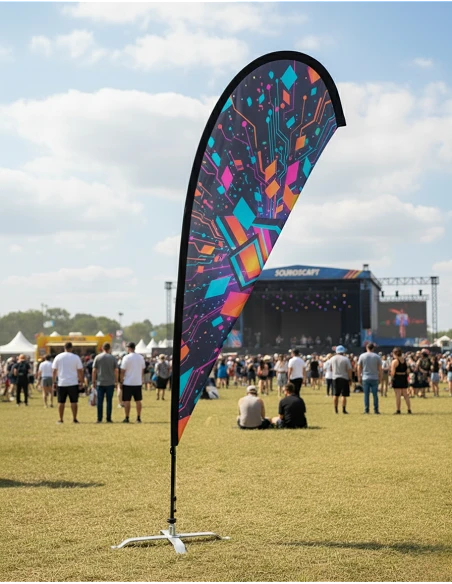 El flag banner personalizado también incluye un asta con forma de redondeada hecha de fibra de vidrio, aluminio y plástico. Además, es compatible con todos los soportes para flag banner que podrás encontrar en nuestra página web.
