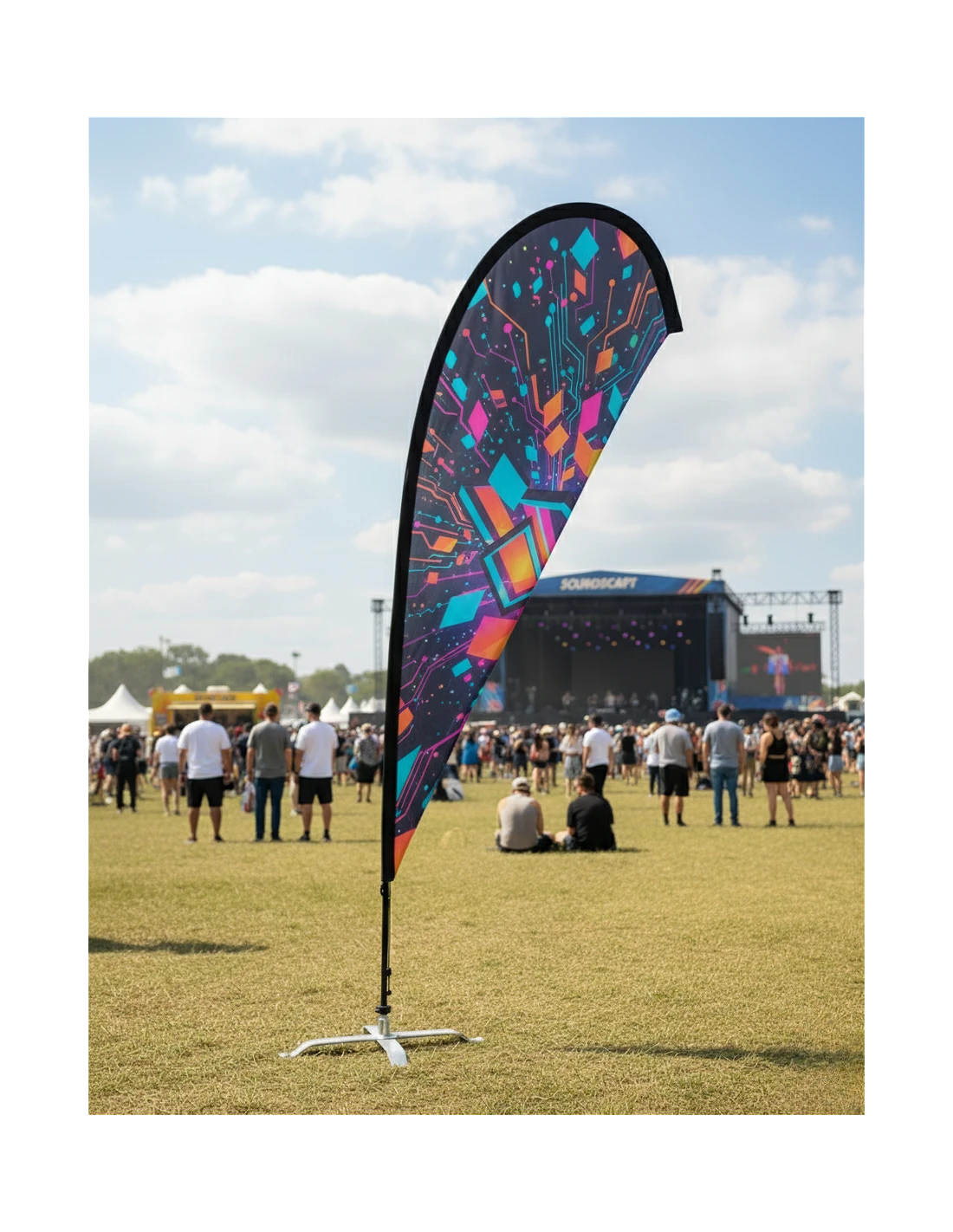 Conjunto de flag banner gota ideal para ferias, celebraciones o eventos como festivales, congresos o competiciones. La gráfica puede confeccionarse en diferentes tallas, según la que se necesite para la ocasión: talla S (750x1735mm), M (922x2166mm), L (1037x2986mm) y XL (1368x3528mm). Si lo deseas, la puedes personalizar al completo con un diseño original, el logotipo de tu marca o el nombre del evento o feria. Las gráficas de flag banner publicitarios son personalizados ya que están sometidos a la técnica de sublimación consiguiendo un diseño único y original.