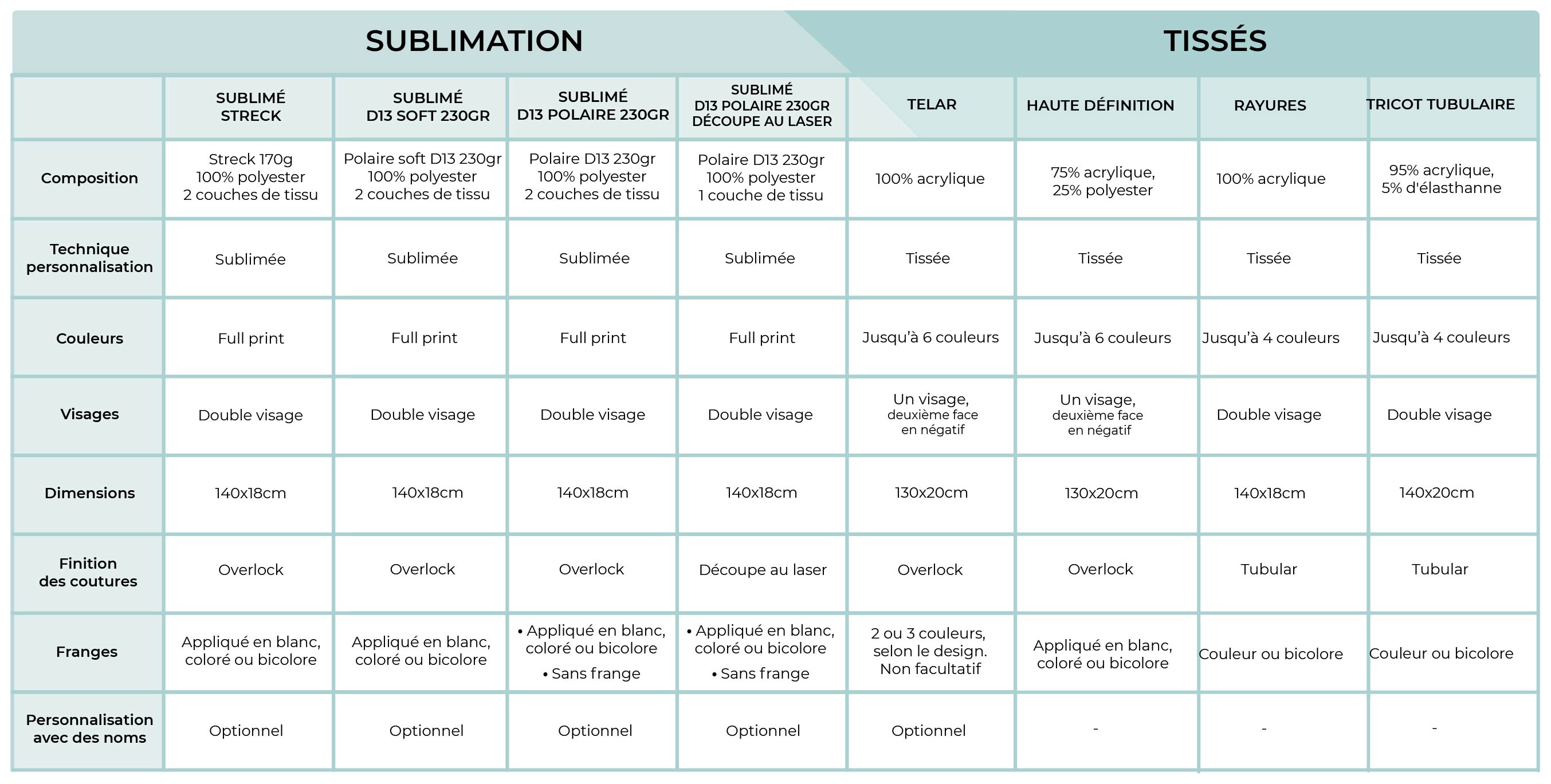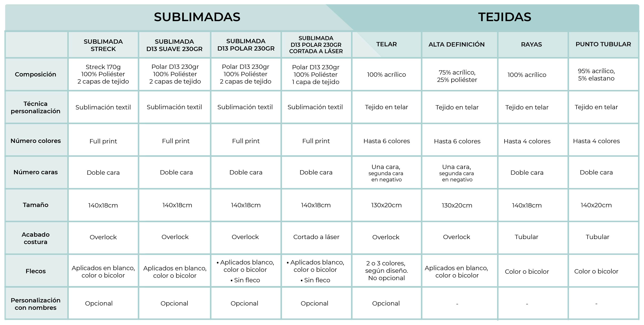 Tabla comparativa de bufandas sublimadas y bufandas tejidas