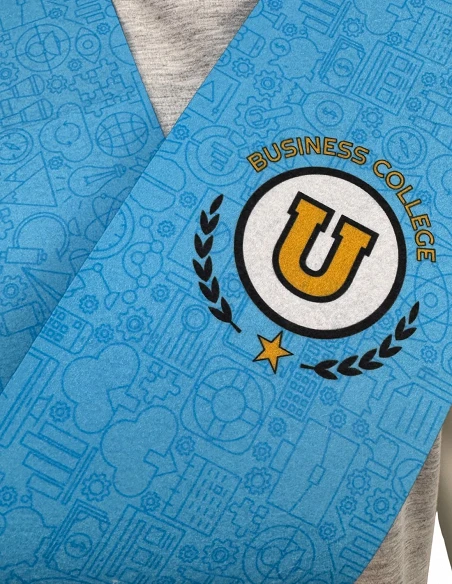 La **banda di laurea sublimata** consente design veramente originali: **stampe speciali**, sfondi aziendali, nomi delle promozioni, loghi degli sponsor o **combinazioni bicolore per doppie lauree**. È una **soluzione ideale quando è necessario un colore Pantone specifico** e una presenza di marca omogenea in tutto l'auditorium, sia per le bande di laurea universitarie che per quelle per bambini.