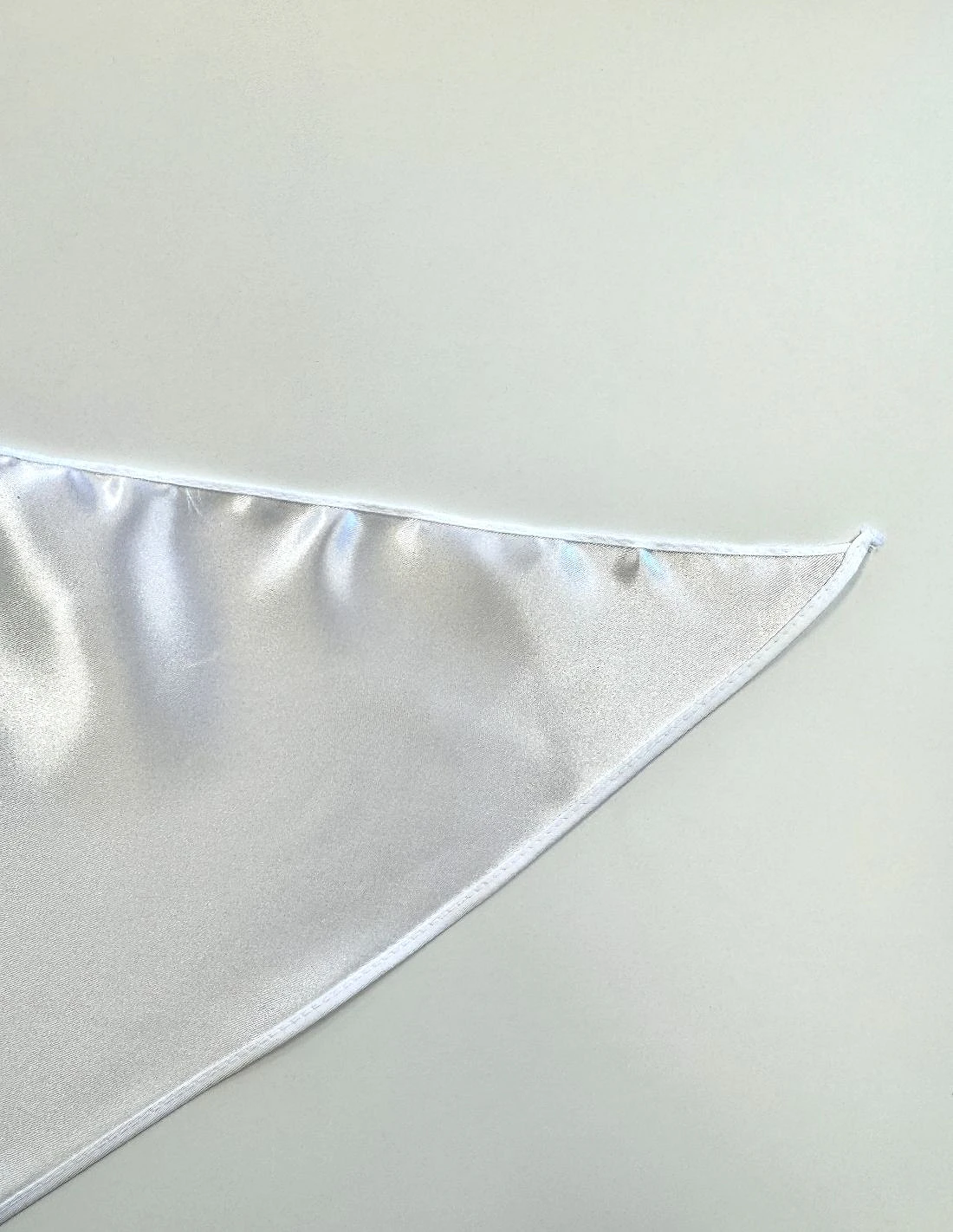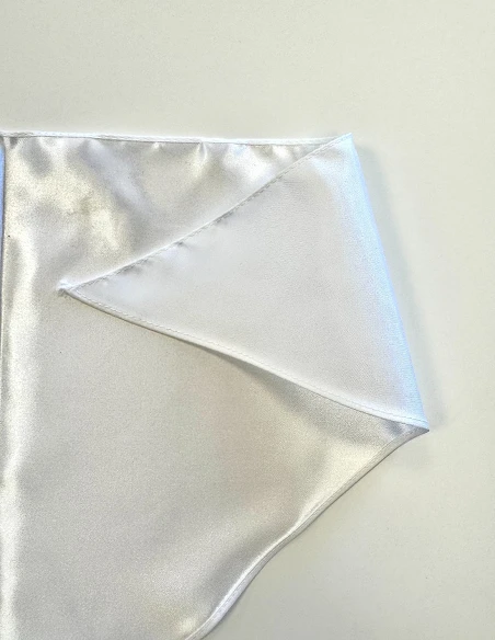 Pañuelo de raso blanco outlet en 100% poliéster de 110 g y acabado brillante. Referencia con costura al revés, el pespunte está realizado en la parte mate. Ideal para fiestas y eventos donde se prioriza el precio sin renunciar a una imagen llamativa.