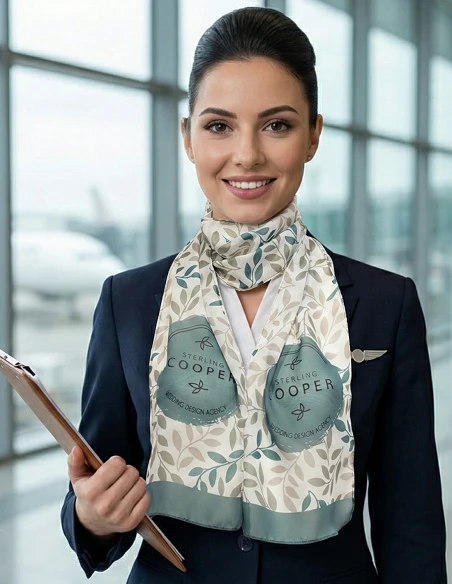 El pañuelo o foulard es perfecto como complemento de la vestimenta de azafatas en eventos y celebraciones especiales. También, es perfecto como regalo original y único de publicidad y merchandaising.